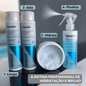 Gaboni kit versatile com 4 passos Hidrata imediata e brilho lamelar cabelos revitalizados e cheios de vida. Kit composto por: Shampoo versatile 250 ml Condicionador versatile 250 ml Máscara versatile 250 g Leave-in versatile 200 ml Shampoo hidratação imediata e brilho lamelar Contém: pantenol / extratos de hortelã, alecrim, hamamélis, calêndula, camomila e malva / óleo de babaçu / de murumuru / proteína do trigo. Rendimento aproximado: 15 aplicações Ph: 5,0 a 6,0 Cabelos saudáveis, revitalizados e cheios de vida. Limpa suavemente os fios, promovendo maciez e hidratação. Com ativos de alta performance, para uso diário, garante brilho e uma agradável sensação de limpeza duradora. Sua fórmula emoliente e tonificante, mantém a umidade natural dos fios sem provocar oleosidade, hidratando, condicionando e renovando o brilho natural dos cabelos. Modo de usar: aplique sobre os cabelos molhados e massageie até obter uma espuma rica e cremosa. Enxágue até a retirada completa do produto e repita a operação. Livre de sal cloreto de sódio e parabenos. Condicionador hidratação imediata e brilho lamelar Contém: pantenol / extratos de hortelã, alecrim, hamamélis, calêndula, camomila e malva / óleo de babaçu / de murumuru / proteína do trigo. Rendimento aproximado: 15 aplicações Ph: 5,0 a 6,0 Sua fórmula enriquecida com pantenol, extrato de alecrim e calêndula é o segredo para manter os fios hidratados, desembaraçados e com brilho radiante, diariamente. Esses ativos poderosos atuam como um hidratante de longa duração, com ação reparadora e protetora, revitalizando o fio da raiz às pontas e evitando a formação de pontas duplas, sem deixar um filme pesado sobre os cabelos. Modo de usar: aplique o condicionador versatile nos cabelos limpos, começando pelas pontas. Faça uma massagem suave até que os fios fiquem macios. Deixe agir por alguns minutos e enxágue abundantemente. Máscara hidratação imediata e brilho lamelar Rendimento aproximado: 22 aplicações Ph: 3,5 a 4,5 É uma poderosa máscara de hidratação multibenefícios, a solução perfeita para quem deseja restaurar os fios danificados, proporcionando brilho, maciez e hidratação profunda. Resultando em cabelos muito mais fortes e resistentes às agressões externas, com uma aparência saudável, brilhante e cheia de vida. Modo de usar: aplique sobre os cabelos limpos e úmidos, distribuindo o produto, mecha a mecha. Deixe agir por 5 a 10 minutos, com ou sem fonte de calor. Enxágue a seguir. Leave-in conditioner versatile Proteção contra o sol, mar e piscina. O leave-in coditioner versatile é hidratante e desembaraçante, que minimiza a formação de pontas duplas e o rompimento do fio. Contém ativos termoprotetores para escova ou chapinha e filtro solar específico para os cabelos. Fórmula elaborada com pantenol, que nutre profundamente os fios revitalizando e dando vida aos cabelos. Enriquecido com proteína do trigo, que protege os fios, é altamente condicionante e proporciona brilho intenso. Contém extrato de chá verde, que tem propriedades antienvelhecimento, adstringente, refrescante, purificante e antioxidante. Contém filtro solar e protetor térmico. Modo de uso: agite bem antes de usar. Vaporize o leave-in conditioner versatile sobre o cabelo limpo e úmido começando pelas pontas até a parte superior do cabelo. Excelente para ser utilizado durante o corte de cabelo, depois penteie e proceda a escova. Benefícios: 1- para todos os tipos de cabelos; 2- hidratação e brilho, sem pesar; 3- termoproteção e filtro solar; 4- protege contra o sol, vento, mar e piscina; 5- previne pontas duplas; 6- reduz a quebra; 7- nutre e revitaliza os fios; 8- adstringente, refrescante e purificante; 9- antioxidante, prolonga a durabilidade da coloração. 10- antienvelhecimento dos fios.
