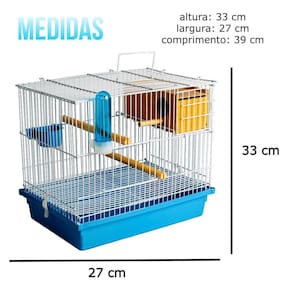 ESPECIFICAÇÕES Comprimento: 39cm Largura: 27cm Altura: 33cm Material: Arame BTC, tinta em pó e resina plástica. Itens: 01 Aramado gaiola. / 01 Bandeja grande. / 01 Ninho grande de madeira. / 02 Comedouros com alça de plástico. / 02 Poleiros de madeira/ 04 Presilhas fixar bandeja. / 01 Bebedouro.
