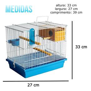 ESPECIFICAÇÕES Comprimento: 39cm Largura: 27cm Altura: 33cm Material: Arame BTC, tinta em pó e resina plástica. Itens: 01 Aramado gaiola. / 01 Bandeja grande. / 01 Ninho grande de madeira. / 02 Comedouros com alça de plástico. / 02 Poleiros de madeira/ 04 Presilhas fixar bandeja. / 01 Bebedouro. Ean: 7908396711483