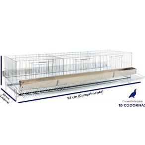 Acompanha 01 gaiola poedeira para codornas, 01 coxo para alimentação, 01 coxo para água e 01 bandeja zincada prata para recolhimento de fezes.