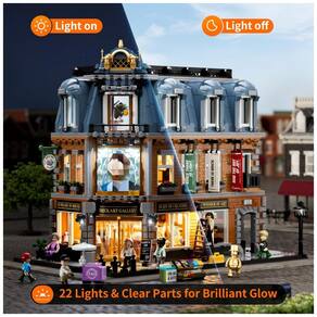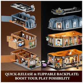 A estrutura de esquina apresenta design de desmontagem rápida em três camadas, acesso total pela traseira aberta e piso do segundo andar retrátil, com base modular 48x32 cm para integração com outros edifícios de rua. Inclui mais de 60 blocos impressos (sem adesivos), 11 peças douradas para telhado e extensas partes transparentes no térreo para amplificação de efeitos luminosos.