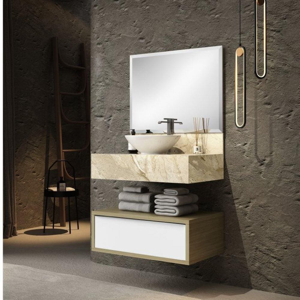 Conjunto 80cm para Banheiro com Espelho, Gaveteiro, Bancada em Porcelanato e Cuba de Louça Bumi Travertino