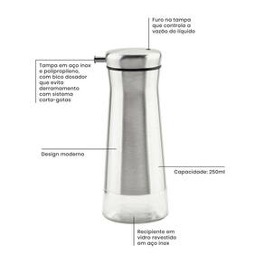 Altamente durável, mantém as características , preservando a beleza, a higiene e a durabilidade do material. Design moderno. Beleza e praticidade em seu design. Ideal para ir à mesa. Tampa em aço inox e polipropileno, com bico dosador que evita derramamento com sistema corta-gotas. Furo na tampa que controla a vazão do líquido. Recipiente em vidro revestido em aço inox. Capacidade: 250ml