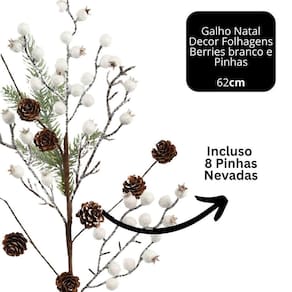 Crie uma decoração natalina encantadora com o Galho Nevado Rústico com Berries Brancas e 8 Mini Pinhas. Com visual natural e acabamento com efeito de neve, é perfeito para arranjos de mesa, vasos decorativos, guirlandas ou para complementar a árvore de Natal.