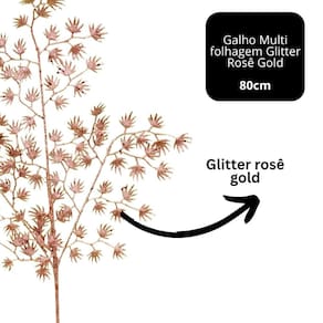 Com 80cm de comprimento e 30cm de largura, este galho possui uma composição rica em folhagens variadas com acabamento em glitter rosê gold, criando um efeito cintilante e elegante. O visual delicado e moderno é perfeito para decorações contemporâneas ou clássicas que buscam um toque de glamour.