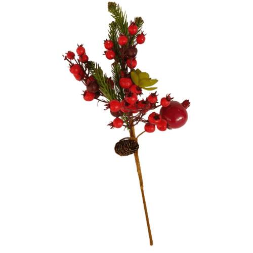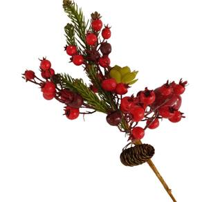 Galho Decorativo de Natal 40cm com Frutas Silvestres, Romã, ramos Verdes e pinha Natural, confeccionado em EPS (isopor), Plástico e haste de arame revestida.