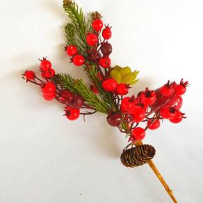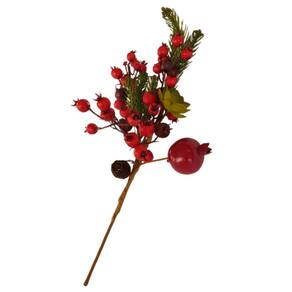 Galho Decorativo de Natal 40cm com Frutas Silvestres, Romã, Ramos Verdes e Pinha Natural, confeccionado em EPS (isopor), Plástico e haste de arame revestida.