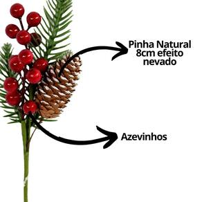 Detalhes: Pinha natural 8cm com efeito neve e azevinhos vermelhos