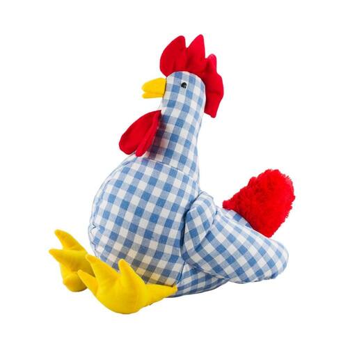 Bichinho de pelúcia no formato de um galo com pano quadriculado azul. Galo com patas amarelas soltas, ao colocar na mesa é como se estivesse sentado. Material: poliéster e pano; Enchimento: fibra de poliéster; Produto certificado por Órgão acreditado pela CGCRE do INMETRO