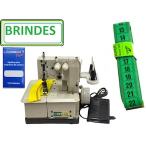 2 agulhas 3 fios Largura da costura = 4,8mm Altura calcador = 6,0mm Tipo de Agulha B63 Comprimento máximo do ponto = 4mm Lubrificação manual com buchas auto-lubrificantes a base de grafite e eixo central acoplado em 2 rolamentos Buchas da barra de agulha em bronze sinterizado Rotação máxima = 2000 RPM Motor = 10500RPM Potência 250W