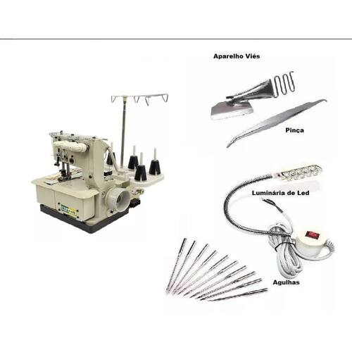 – 3 agulhas – 4 fios – Largura da costura = 6,35mm – Altura calcador = 6,0mm – Tipo de Agulha B63 ou UYx128 – Comprimento máximo do ponto = 4mm – Lubrificação manual com buchas auto-lubrificantes a base de grafite e eixo central acoplado em 2 rolamentos – Buchas da barra de agulha em bronze sinterizado – Rotação máxima = 2000 RPM – Motor = 10.500RPM – Potência 250W – Voltagem 110 ou 220 Acompanha 1 kit de acessórios: 1 - Aparelho de viés 1 - Luminária de LED com haste flexível 1- Pinça 10 - Agulhas Extras Pedal Moderno com controle na aceleração