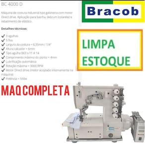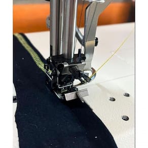 Máquina de costura industrial tipo galoneira com motor Direct drive. Aplicação para bainha, debrum (colarete) e rebatimento de elástico.