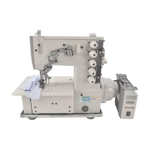Máquina de costura industrial tipo galoneira com motor Direct drive. Aplicação para bainha, debrum (colarete) e rebatimento de elástico.Detalhes técnicos: 3 agulhas 5 fios Largura da costura = 6,35mm / 1/4? Altura calcador = 6mm Tipo agulha B63 x 11 # 14 Comprimento máximo do ponto = 4mm Lubrificação automática Rotação máxima = 3000 RPM Motor Direct drive (motor acoplado internamente na máquina) AUTOVOLT Potência = 550w COMO É ENVIDADO O PRODUTO:- Cabeçote completo com porta fios;- Estante desmontada composta por: Tampo de madeira revestido em fórmicaimpermeável, Pé de ferro pintado por imersão e acessórios paramanutenção.EMBALAGEM:- Mesa medindo 0,50 x 1,10 x 0,75 = 0,4125m3;- Cabeçote na caixa medindo 0,34 x 0,48 x 0,46 = 0,075m3;- Volume total = 0,57m3;- Peso real = 65kg- Peso cubado para transporte = 135kg
