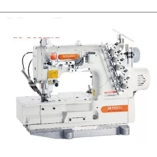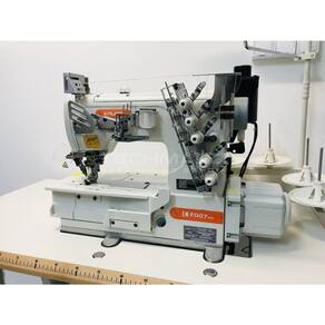 Espaçamento disponível para agulhas duplas: 4,0; 4,8 mm (opcional), para três agulhas: 5,6 mm e 6,4 mm, possibilidade de desligar o entrelaçamento superior , equipado de série com régua de bainha. Além disso, pode ser equipado com transfer para costuras overloque, bainhas, costura em elásticos, etc.