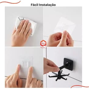 Passo a passo para a instalação: - antes de instalar o gancho adesivo, certifique-se de que a superfície esteja limpa, seca, livre de poeira e óleo. - remova o plástico protetor do adesivo que vem com o gancho - cole-o em qualquer superfície lisa e pressione. - encaixe o gancho 360 no adesivo e prontinho Dica: recomenda-se deixar 2 horas antes de pendurar qualquer item para garantir que o produto esteja firme e fixo.