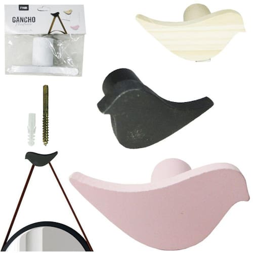 O gancho é composto de duas peças principais. A peça traseira, cilíndrica, comporta um parafuso com bucha (fornecido com o produto) que você irá utilizar para afixar na parede. A peça frontal, com formato de passarinho, cumpre a função decorativa e de gancho.