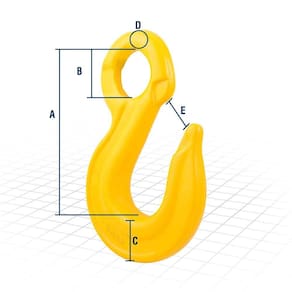Conteúdo da Embalagem: 1 Gancho olhal sem trava. Material fabricado e testado conforme a norma EN 1677. Pintado na cor amarela, proporcionando maior resistência à oxidação. Utilizado como elemento de conexão em cabos de aço, lingas de correntes, cintas de poliéster, entre outros, nos processos de movimentação e içamento de cargas. Uso industrial. Material.:Aço liga grau 8 Diâmetro da corrente:16 mm Carga de trabalho do gancho olhal:8,00 tf Diâmetro interno do olhal (B):50,00 mm Abertura do gancho (E):46,00 mm Altura do gancho (C):48,00 mm Comprimento total do gancho (A + C + D):254,50 mm Espessura do olhal (D):23,00 mm Fator de segurança do gancho olhal:4:1 Norma de referência do gancho olhal:EN 1677 Massa aproximada (peso):2,85 kg