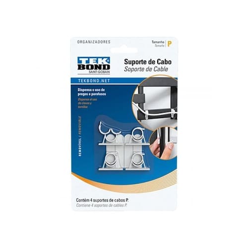 Gancho Para Organização de Cabos P Tekbond A linha de ganchos e organizadores adesivos da Tekbond oferece uma solução prática e resistente que permite decorar e organizar a sua casa ou o seu ambiente de trabalho. Marca:Tekbond Part number: 20801000702 Modo de Usar: 1. Limpe a superfície com álcool, removendo qualquer resquício de oleosidade ou poeira. Importante: O uso de detergentes ou outros produtos pode comprometer o desempenho da fita adesiva. 2. Remova o liner protetor da fita e aplique o produto no local desejado. 3. Faça pressão na peça por 30 segundos com certa força para potencializar a resistência da fita. 4. Aguarde 1 hora antes de utilizar o gancho. Importante: 1. Quanto maior a área de contato da fita, mais resistente é a aplicação. Por este motivo, não aplique os ganchos em superfícies irregulares, curvas ou com texturas. 2. As fitas não foram projetadas para suportar objetos tridimensionais de grande volume como, por exemplo, prateleiras. Não recomenda-se a aplicação de ganchos e fitas para objetos que fazem a pressão em forma de pêndulo. 3. Verifique a superfície onde será aplicada a fita / gancho. No momento da remoção, o adesivo da fita pode danificar superfícies com pintura ou reboco mal fixados e sem resistência. 4. Confira a carga de resistência para cada um dos produtos descritos nesta embalagem. Para Remover a Fita Permanente: 1. Passe um fio de Nylon ou similar - vagarosamente - entre a parede e o produto para soltar a fita adesiva. 2. Durante este processo, algum resíduo de fita pode ficar na parede. Utilize uma esponjinha com água e sabão para a limpeza da área. Para Remover a Fita Smart Removível: 1. Quando necessário, retire o gancho do suporte para ter acesso a lingueta da fita. Caso contrário, a lingueta já estará visível no produto. 2. Segure o suporte ou o gancho com uma das mãos e com a outra, puxe a lingueta para baixo, paralela à parede, até descolar totalmente a fita da parede. Nota: Uma vez removidas, as fitas não são reaproveitáveis. Ean: 7898543382737