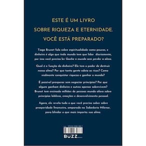 ESTE É UM LIVRO SOBRE RIQUEZA E ETERNIDADE. VOCÊ ESTÁ PREPARADO? “O ANTÍDOTO CONTRA O AMOR AO DINHEIRO É TER A ESPIRITUALIDADE COMO PRIORIDADE.“ Tiago Brunet fala sobre espiritualidade como poucos, por isso Ganhe o mundo sem perder a alma é tão necessário. Esse tema, ainda pouco debatido, tem gerado conflitos desde a Antiguidade até os dias de hoje — numa época em que, se por um lado, a pobreza ainda é realidade, por outro, muitos têm prosperado. Qual é a função do dinheiro? Ele tem o poder de destruir nossa alma? Por que tanta gente odeia os ricos? É possível prosperar sem negociar princípios? Por que alguns ganham dinheiro e outros apenas sobrevivem? Brunet tem ensinado milhões de pessoas mundo afora sobre princípios bíblicos, emoções e desenvolvimento pessoal. Agora, ele revela tudo o que sabe sobre prosperidade, amparado na Sabedoria Milenar, para blindar o que mais importa: a alma do ser humano.