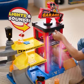 - Acelere os motores: a garagem Disney Junior Mickey Mouse Ready to Race tem tudo o que uma criança precisa para ajustes, reparos e muita diversão em ritmo acelerado.