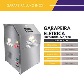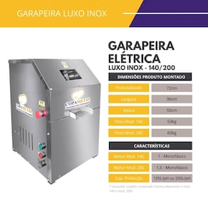 Garapeira Moenda de Cana Elétrica Luxo Inox FC140 220v FC2 A Garapeira Luxo Inox 140 FC2 é ideal para quem busca maior desempenho na extração de caldo de cana. Equipada com motor de 1 CV e moenda em inox, ela é perfeita para locais com alta demanda como feiras, quiosques e lanchonetes. Com capacidade para até 140 litros por hora, oferece rendimento elevado com economia e facilidade de uso. Sua estrutura reforçada em aço carbono com acabamento inox garante higiene e longa vida útil, mesmo em uso contínuo. Informações sobre o equipamento Peso: 53 kg Capacidade de produção: até 140 litros/hora Tensão: 220v Motor: 1 CV – Monofásico Potência: 735,40 W Rotação do motor: 1750 rpm Rotação da moenda: 23 rpm Consumo elétrico: 0,74 kW/h Composição Material da estrutura: Aço Carbono Material da capa: Aço Inox Material da moenda: Aço Inox Material da bica: Aço Inox Pintura: Eletrostática Resistente Dimensões do equipamento Altura: 50 cm Largura: 36 cm Profundidade: 72 cm Garantia3 Meses Contra Defeito de Fabricação Ean: 7898697032632