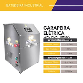 Garapeira Moenda de Cana Elétrica Luxo Inox FC200 220v FC2 A Garapeira Luxo Inox 200 FC2 é ideal para quem busca maior desempenho na extração de caldo de cana. Equipada com motor de 1,5 CV e moenda em inox, ela é perfeita para locais com alta demanda como feiras, quiosques e lanchonetes. Com capacidade para até 200 litros por hora, oferece rendimento elevado com economia e facilidade de uso. Sua estrutura reforçada em aço carbono com acabamento inox garante higiene e longa vida útil, mesmo em uso contínuo. Informações sobre o equipamento Peso: 60 kg Capacidade de produção: até 200 litros/hora Tensão: 220v Motor: 1,5 CV – Monofásico Potência: 1103,2 W Rotação do motor: 1750 rpm Rotação da moenda: 28 rpm Consumo elétrico: 1,10 kW/h Composição Material da estrutura: Aço Carbono Material da capa: Aço Inox Material da moenda: Aço Inox Material da bica: Aço Inox Pintura: Eletrostática Resistente Dimensões do equipamento Altura: 50 cm Largura: 36 cm Profundidade: 72 cm Garantia3 Meses Contra Defeito de Fabricação Ean: 7898697032595