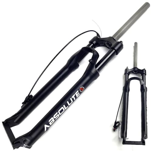 A suspensão Absolute é projetada para Mountain Bikes com aro 29, proporcionando um curso de 100mm para absorção de impactos em terrenos acidentados. Fabricada em aço carbono e alumínio, oferece resistência e durabilidade, mantendo o peso relativamente leve. A suspensão apresenta um sistema de amortecimento com molas especiais e elastômero, além de compatibilidade com freios a disco. A circunferência externa da espiga é de 28.6mm, enquanto a interna é de 25.4mm, com uma bengala de 30mm e espiga de 25 centímetros, garantindo robustez e estabilidade. Para maior conveniência, possui regulagem de pré-carga e trava no guidão, permitindo ajustes rápidos conforme o terreno. Com um peso aproximado de 2.630g, esta suspensão é uma excelente escolha para quem busca performance e confiabilidade em suas aventuras de mountain bike.