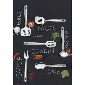 Totalmente feito de aço inox, por isso não solta nenhum resíduo nos alimentos, mantendo-os saudáveis. Altamente durável, mantém suas características , preservando a beleza, a higiene e a durabilidade do material. Possui furo no cabo, o que permite incluí-la na decoração da cozinha. Pode ser lavado diariamente na máquina de lavar louças.