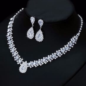Conjunto colar e brinco em formato de gota banhado a ouro branco com cristais austríacos