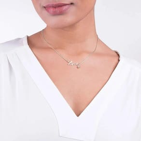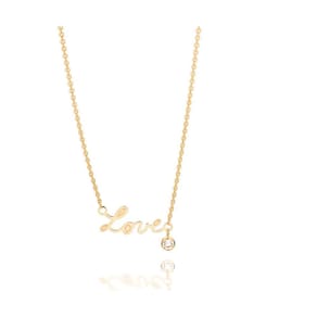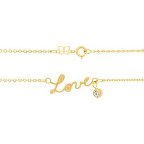 gargantilha formada por fio elo cadeado batido e frizado tendo pendant "love" com cristal de 4mm pendurado. med 45 cm