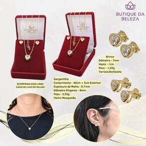 Gargantilha Folheada A Ouro 40Cm + Ext E Brinco Solitário Coração De Pedra Zircônia Especificações do produto Gargantilha - 40cm + 5cm extensor Espessura da malha - 0,7mm Diâmetro pingente - 9mm Peso - 3,55g Fecho mosquetão Brinco de coração Diâmetro - 7mm Haste 1cm Peso 1,45g Tarraxa borboleta Descrição do produto Conjunto folheado a ouro colar 40cm com extensor e brinco folheado a ouro solitário zircônia coração. Kit composto por corrente em malha veneziana com pingente em pedra cravejada formato coração com brinco coração. Para as amantes de conforto, jovialidade e praticidade. Conjunto super confortável , a gargantilha não incomoda e possui um ótimo caimento no busto. O brinco de zircônia por sua vez tem características minimalistas sem deixar a elegância e brilho da zircônia de lado. Não perca essa oportunidade e tenha em mãos esse lindo conjunto de semijoias folheadas a ouro. Nós da butique da beleza temos as peças mais exclusivas para os clientes mais exigentes. O que oferecemos Um banho de ouro 18k, com qualidade , cor e tonalidade idênticas ao de uma peça de ouro 18k. Vendemos a experiência de você poder usar um produto arrojado, se sentir bela o e elevar sua autoestima. Embalagem Caixa veludo de luxo foto do anúncio para você guardar sua semijoia e mantê-la brilhante por muito tempo. É bijuteria ou semijoia Semijoias todas nossas peças são semijoias, ou seja a deposição de ouro sobre o metal pode ser até 250 vezes maior que a quantidade de ouro 18k depositada em uma peça de bijuteria. Portanto o que nós oferecemos é qualidade. É banhado ou folheado a ouro Os dois termos significam a mesma coisa, referem-se ao processo de galvanoplastia onde o metal, nesse caso o ouro , é adicionado a peça, conferindo proteção, brilho e cor, sendo estas características gerais de uma semijoia de qualidade. As semijoias dão alergia Não Nossos produtos são níquel free, cádmio free e Cinza free, todos esses compostos químicos são alérgicos e estão fora de nosso processo de produção. Tem Sim Oferecemos 6 meses mediante apresentação do certificado de Marca: Não Informado Ean: 7893692915881
