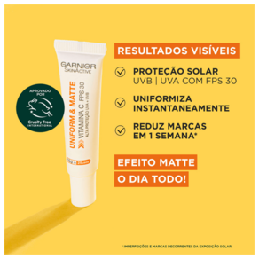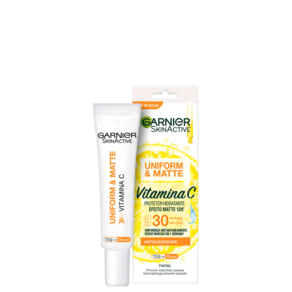 O Protetor Hidratante Facial Garnier SkinActive Uniform & Matte Vitamina C FPS 30 garante uma pele matificada por até 12h, enquanto promove ação antioxidante, anti-marcas e anti-manchas. O filtro FPS 30 entrega proteção contra os nocivos raios UVA e UVB. Sua fórmula, conta com Vitamina C e ativos naturais, capazes de reduzirem estimularem o colágeno, contarem com ação antioxidante e corrigirem tom, em apenas uma semana. Um único produto garante a hidratação, controle de oleosidade, uniformização e proteção.