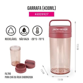 O copo transparente de 430 ml é ideal para levar água, suco ou chá para o escritório ou escola. Possui um filtro infusor, fecho colorido e alça de mão. É leve e fácil de carregar. Produto com qualidade Jacki Design. Conheça a linha completa da coleção CONCEPT e complete o seu kit! (INSTRUÇÕES DE USO: Não vai ao micro-ondas; Temperatura de uso: -20C ~80C; Limpe usando uma esponja macia e detergente).
