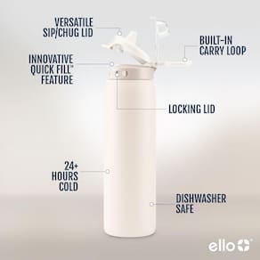Ello Pop & Fill Garrafa de água de aço inoxidável de 640 ml com tecnologia de enchimento rápido, metal isolado a vácuo de parede dupla, tampa de bloqueio à prova de vazamento, Sip and Chug, - Tampa de enchimento rápido: Livre-se do incômodo de desaparafusar as tampas. Em vez disso, abra para recargas rápidas e convenientes em segundos, mantendo você em movimento sem perder o ritmo. - Gole duplo e chugue: Pop & Fill se adapta às suas necessidades de hidratação - beba um canudo com o apertar de um botão ou abra-o para uma bebida saudável. - 100% à prova de vazamento: carregue com confiança! A garrafa possui uma vedação segura e à prova de vazamento, permitindo que você a jogue em sua bolsa sem preocupações. O mecanismo de bloqueio adicional garante tranquilidade sem derramamentos em mochilas, bolsas e bolsas de ginástica. - Seguro para lava-louças: manter sua garrafa de água limpa nunca foi tão fácil. Todas as partes do Pop & Fill podem ser lavadas na lava-louças, facilitando a limpeza. - Fácil de viajar: leve sua garrafa de água onde a vida levar você, graças ao laço de transporte integrado. Prenda-o à sua mochila, bolsa de ginástica ou carregue-o à mão. A capa protetora do bico garante um bico limpo, tornando-a perfeita para o seu estilo de vida em movimento.