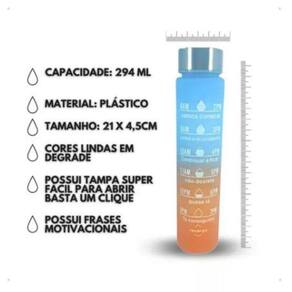 Garrafa De Água Motivacional 300ml Booglee Garrafa de Água 300 ML com frase motivacional e marcação de nível de água por horário, para fazer um melhor acompanhamento diário da quantidade de água tomada.
