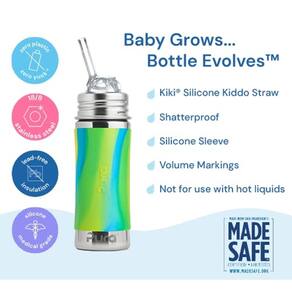 O copo de canudo Pura possui uma garrafa de aço inoxidável de qualidade alimentar (18/8), canudo de silicone de grau médico, capa de viagem, manga e nenhuma peça de plástico! O canudo de silicone incluído apresenta um design de duas peças com um canudo de silicone interno que pode ser separado do bocal para facilitar a limpeza. O bocal de silicone do canudo pode ser utilizado com ou sem o canudo de silicone interno incluído. A palha oferece um fluxo muito rápido. Ideal para crianças de 6 meses a 4 anos, este copo de palha é compatível com todos os componentes de silicone da Pura, incluindo nossos bicos de ventilação natural em várias taxas de fluxo, bico de silicone XL Sipper, discos de vedação e blusa esportiva. Cada copo tem marcas de volume interno pressionadas que podem ser claramente visualizadas no interior da garrafa para facilitar a medição. O frasco também é compatível com bicos e bicos de outras marcas. Com a Pura, você pode ter certeza de que está sempre usando a garrafa mais segura e ecoprogressiva do mercado. Uma vida... uma garrafa