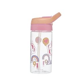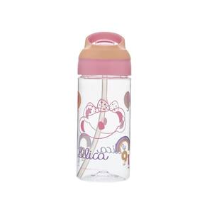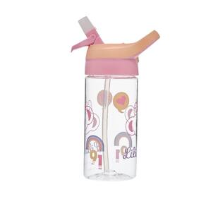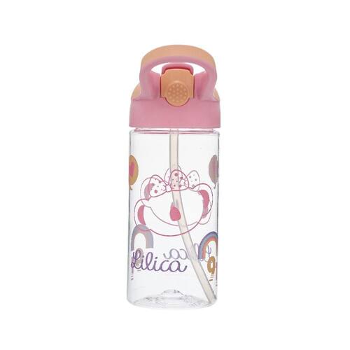 Garrafa de plástico Lilica que conta com canudo, alça para pendurar e silk frontal.