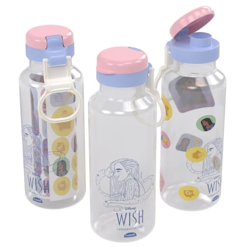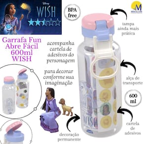 Garrafa Fun com alça e tampa Abre Fácil 600ml, produzida em polipropileno transparente de alta durabilidade, com decoração em silk do novo filme da Disney Wish. Acompanha ainda uma cartela com aproximadamente 24 adesivos dos personagens.