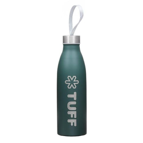 Garrafa Tuff fabricada em aço inox com pintura fosca na cor Verde com capacidade para 750ml e tampa com rosca com cordão.