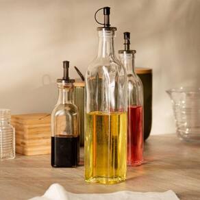 Esta garrafa de vidro com bico dosador é ideal para colocar azeite ou vinagre, facilitando o preparo de pratos e saladas. O vidro é uma escolha comum para recipientes de armazenamento de alimentos devido à sua neutralidade, não transferindo sabores indesejados. Além disso, possui tampa preta, que proporciona um contraste estético, e desempenha um papel fundamental na preservação do azeite, protegendo-o contra a exposição ao ar. Adquira itens de qualidade para sua cozinha, e deixe o preparo das refeições mais agradável.