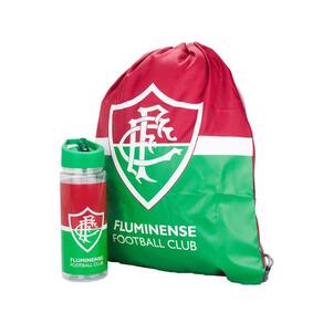 Jogo com uma garrafa de plástico para 500 ml e uma mochila tipo saco ambas customizadas do Fluminense.