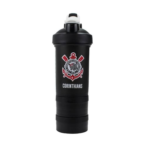 Garrafa Shakeira Mola 2 Compartimentos 500ml - Corinthians Garrafa Shakeira Mola 2 Compartimentos 500ml - Corinthians Garrafa de plástico do tipo shakeira com 500 ml de capacidade. Vem com 2 compartimentos de tampa rosqueável para armazenar suplementos, um com 3x7,5cm e outro com 4x7,5 cm de dimensão. Interior da garrafa vem com mola blender. Tampa abre e fecha e suporte para carregar na mão ou prender na mochila. Tudo isso customizado na cor e gravado com escudo do Sport Club Corinrhians. Detalhes: Peso 0,200 gramas; Altura 26cm; Largura 10cm; Comprimento 10cm; Material: plástico e metal Ean: 4894290281029
