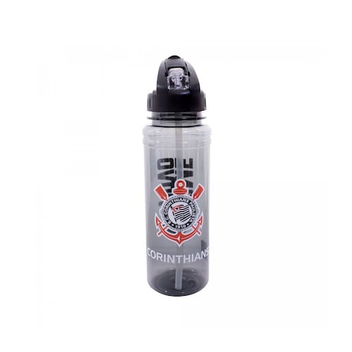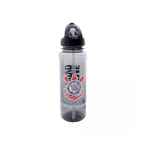 A garrafa do Corinthians é volumosa, vem com tampa modificada para levar na mão com mais comodidade.