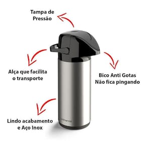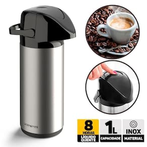 Garrafa térmica 1l inox café água unitermi verona + filtro Garrafa térmica de inox 1l unitermi para café chá e chimarrão + açucareiro e filtro A garrafa térmica verona é produzida em aço inox, que além de garantir um visual clássico e elegante, é um material fácil de limpar e muito resistente. O design de pressão da unitermi foi desenvolvido visando praticidade, pois não é necessário inclinar a garrafa para servir a bebida, basta apertar o botão da tampa. - com alça quefacilitao momento de carregá-la; - higiene fácil devido a sua superfície lisa e por ser desmontável; - sistema de pressão para se servir, além de bico anti-pingo para evitar possíveis vazamentos e a entrada de poeira e insetos; - eficiência térmica: 12 horas frio e 8 horas quente; - possui alça que facilita o manuseio e transporte; - bico anti gotas; - livre de bpa; Obs: o teste para verificação de funcionamento correto da garrafa deve ser feito somente com água, para não danificar a integridade do produto em caso de necessidade de troca. Não aceitaremos devoluções após o uso com café. Especificações técnicas: - capacidade: 1l; - peso: 640g; - material do exterior da garrafa: aço inox; tampa e demais peças em plástico injetado; - material do interior da garrafa: ampola de vidro; - altura garrafa com tampa: 31,5 cm; - largura da garrafa: 11 cm; - largura da tampa: 14 cm; Itens inclusos: - 1x garrafa térmica inox 1l com alça unitermi - 1x filtro suporte para café - 1x açucareiro 350ml