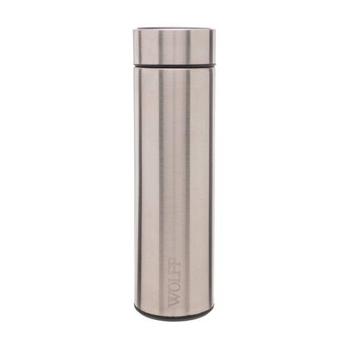 A garrafa térmica com termômetro em led Wolff é o item ideal para te acompanhar no dia a dia. Produzida em aço inox, Seu grande diferencial é o termômetro em Led na tampa da garrafa, que possibilita identificar a temperatura de seu interior com um simples toque. Seu bocal é de fácil limpeza e acompanha um infusor de inox para preparo de chás. Com forte vedação, a bateria é inclusa e sem necessidade de recarga, tendo durabilidade de até 500 dias de uso.