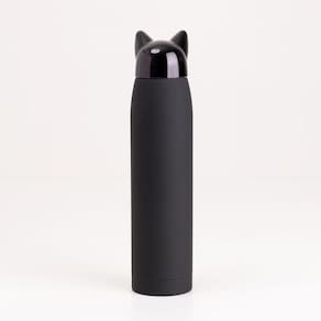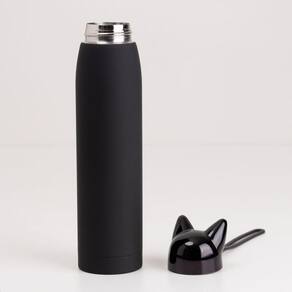 Capacidade para 400 ml; tampa rosqueável (em formato de gatinho) com alça de mão; garrafa em aço inox; capacidade térmica para manter a bebida fria por até 12 horas e quente por até 6 horas.