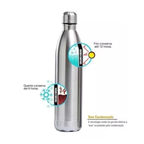 Garrafa térmica em aço inox possui compartimento interno a vácuo, isolando o líquido da parede externa, para melhor conservação da temperatura. Parede dupla. Não umedece a parede de fora. Conserva quente por até 6h e fria por até 12h.