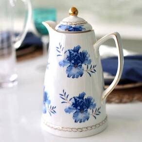 A garrafa térmica de porcelana é um item que traz muito charme para o cafezinho do dia a dia, ou para aquele chá especial entre amigas. A garrafa térmica tem exterior com detalhes floral azul e filetes dourados na tampa, na alça, na borda e na base da garra térmica. Em seu interior, a ampola de vidro é o que garante a temperatura dos líquidos seja preservada por mais tempo na garrafa.