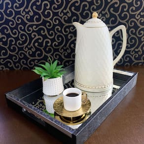 A garrafa térmica de porcelana é um item que traz muito charme para o cafezinho do dia a dia, ou para aquele chá especial entre amigas. A garrafa térmica tem exterior com detalhes de renda creme e filetes dourados na tampa, na alça, na borda e na base da garra térmica. Em seu interior, a ampola de vidro é o que garante a temperatura dos líquidos seja preservada por mais tempo na garrafa.
