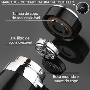 A Garrafa Térmica Gold Sports Adventure Smart Dupla Camada em Aço inoxidável 316 - Com Infusor. Muito eficiente na conservação da temperatura de bebidas geladas ou quentes e também segura muito bem o gás de refrigerantes. A tampa, sem bem fechada, veda totalmente a garrafa, impedindo respingos e vazamentos, BPA FREE, confeccionada em dupla camadas de aço inoxidável 316. A Garrafa Térmica em aço inoxidável 316 Gold Sports Adventure Smart 800ml com infusor possui acabamento de altíssima qualidade, com uma incrível tela LED, localizada na tampa. sensível ao toque, ela te mostra, em tempo real, a temperatura interna da garrafa. Possui alça o que facilita seu transporte.